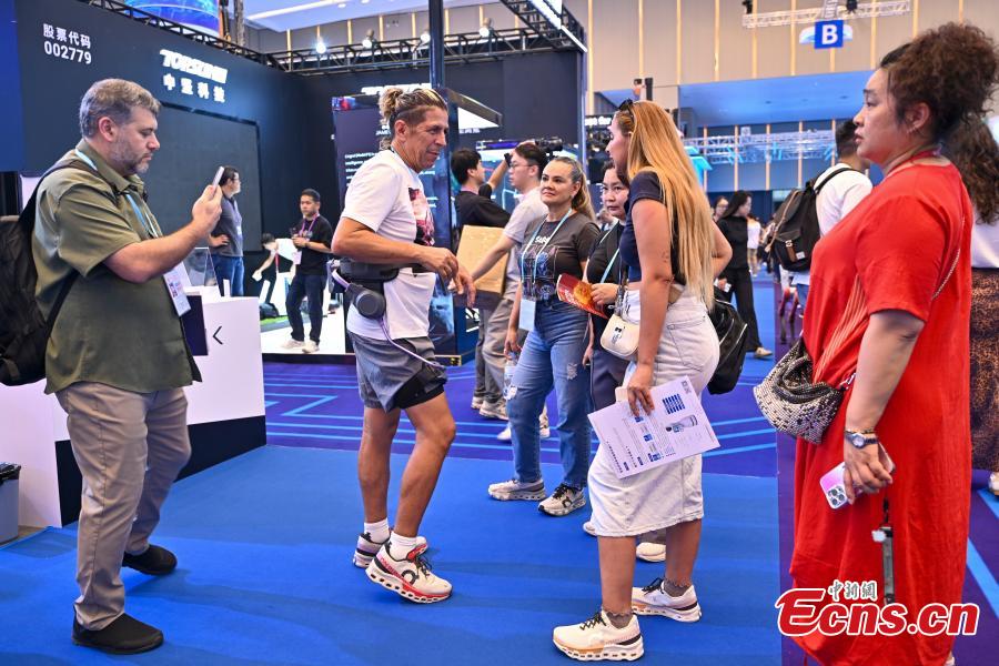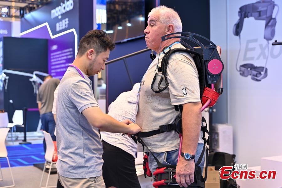 A buyer tries an exoskeleton device at the 138th edition of the China Import and Export Fair in Guangzhou, Guangdong Province, Oct. 15, 2025. (Photo: China News Service/Chen Jimin)