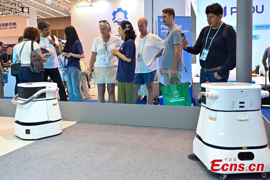 Photo taken on Oct. 15, 2025 shows a continuous flow of visitors in the service robot zone at the 138th edition of the China Import and Export Fair in Guangzhou, Guangdong Province. (Photo: China News Service/Chen Jimin)