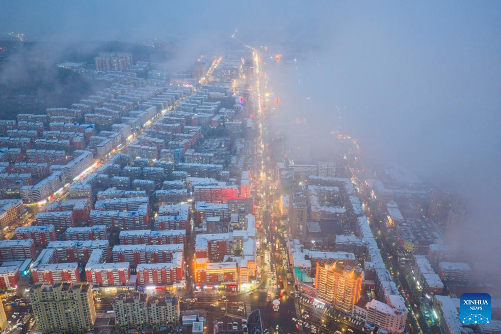 An aerial drone photo taken on Oct. 15, 2025 shows a view of snowy Shuangyashan City in northeast China's Heilongjiang Province. A snowfall hit part of Heilongjiang on Wednesday. (Photo by Han Yang/Xinhua)