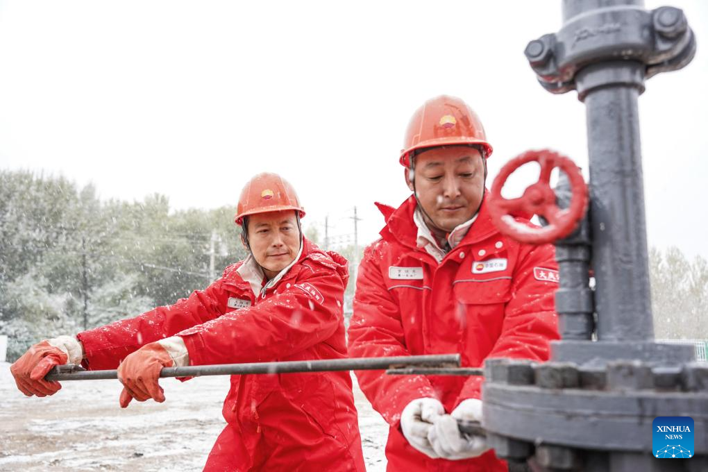 Staff members work in the snow at Daqing Oilfield in Daqing, northeast China's Heilongjiang Province, Oct. 15, 2025. A snowfall hit part of Heilongjiang on Wednesday. (Photo by Ma Ke/Xinhua)