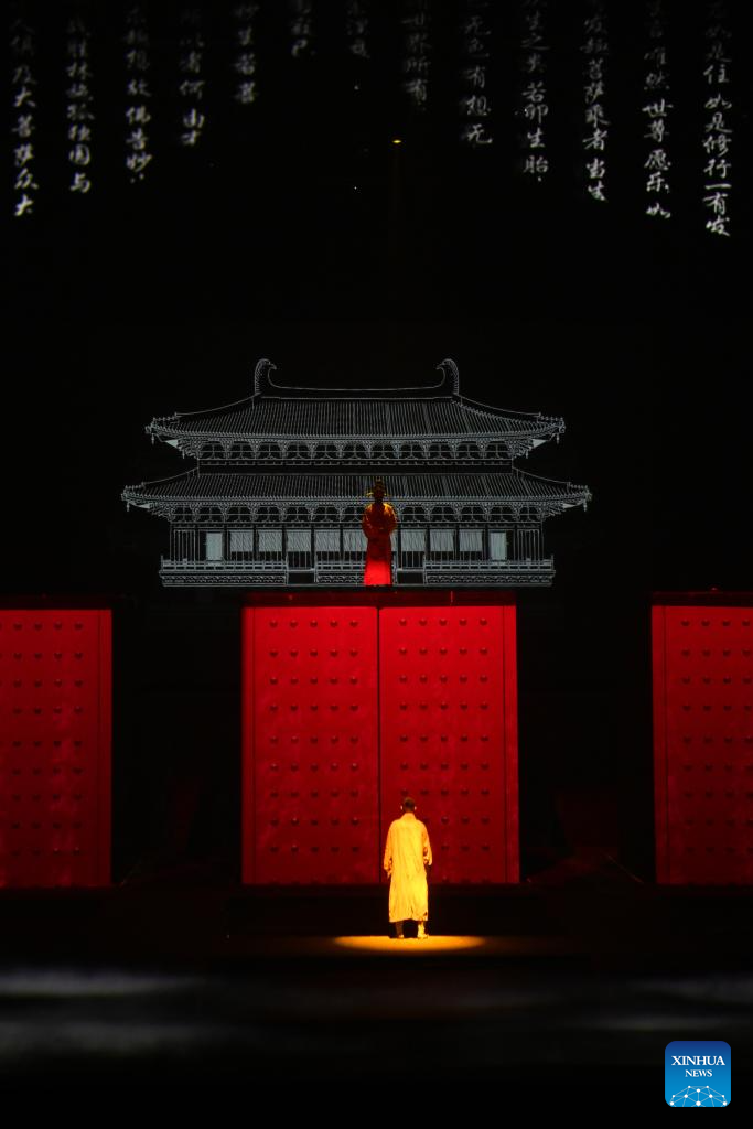 An actor performs during the immersive drama "Encore Dunhuang" in Dunhuang, northwest China's Gansu Province, Oct. 15, 2025. The immersive drama "Encore Dunhuang" showcases Dunhuang's history, costumes, and music and dance culture. The drama have been performed over 1,000 times this year, attracting over 500,000 viewers. (Xinhua/Fan Peishen)