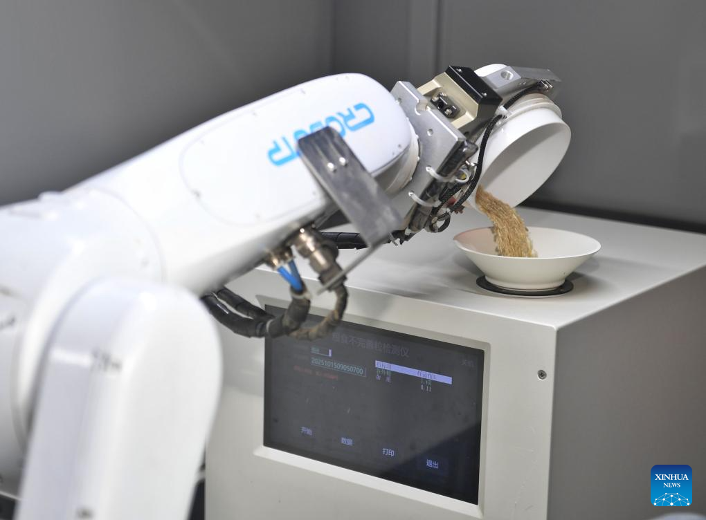 A grain sampling robot automatically examines grain samples at a branch company of China Grain Reserves Group (Sinograin) in Chengdu, southwest China's Sichuan Province, Oct. 15, 2025.