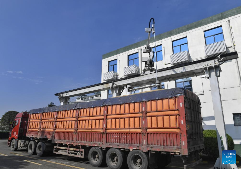 A smart sampling platform collects random samples from inbound grain at a branch company of China Grain Reserves Group (Sinograin) in Chengdu, southwest China's Sichuan Province, Oct. 15, 2025.