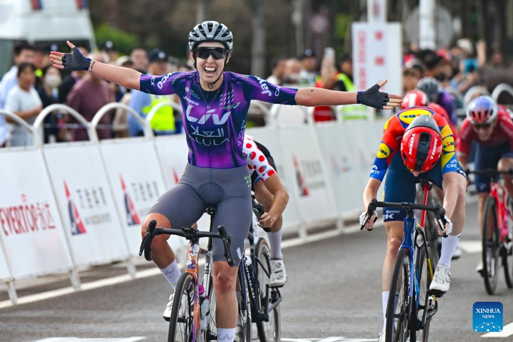 Josie Talbot of Liv-Alula-Jayco poses during the awarding ceremony after the Stage 3 of the UCI Women's WorldTour Tour of Chongming Island road cycling race in Shanghai, east China, Oct. 16, 2025. (Xinhua/Wang Xiang)
