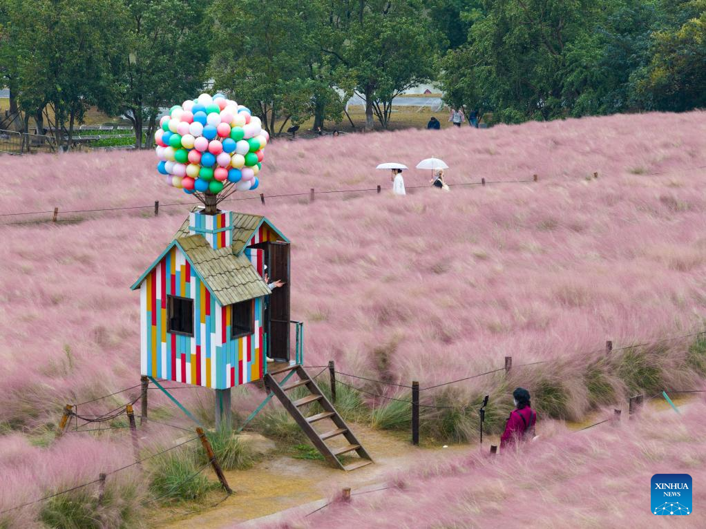 People enjoy sightseeing at the Yiwu Botanical Garden in Yiwu City, east China's Zhejiang Province, on Oct. 19, 2025. People are heading outdoors to enjoy the pleasant autumn days across China. (Photo by Shi Kuanbing/Xinhua)