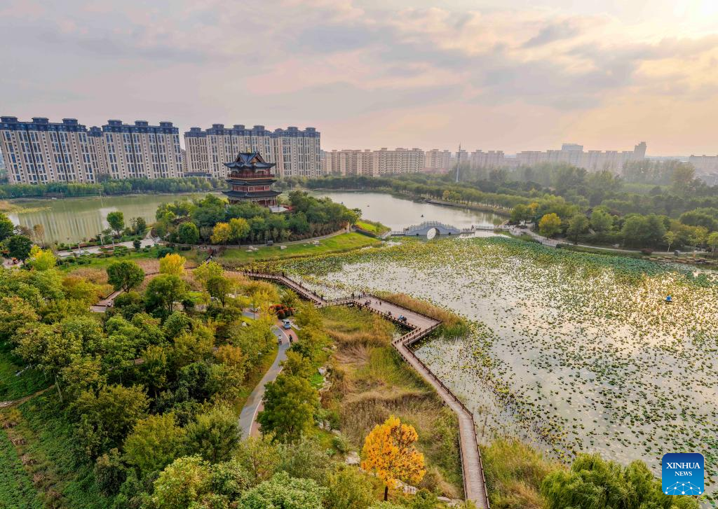 An aerial drone photo taken on Oct. 18, 2025 shows people enjoying sightseeing at a wetland park in Luoyang, central China's Henan Province. People are heading outdoors to enjoy the pleasant autumn days across China. (Photo by Huang Zhengwei/Xinhua)