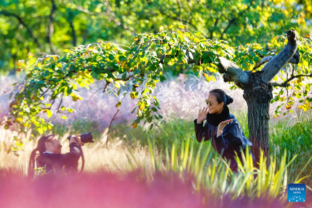 A woman poses for photos at a botanical garden in Binhai New Area, north China's Tianjin, on Oct. 19, 2025. People are heading outdoors to enjoy the pleasant autumn days across China. (Photo by Du Penghui/Xinhua)
