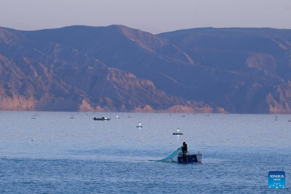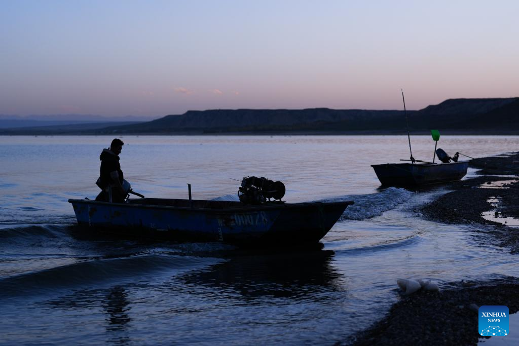 A worker sorts newly-harvested silver fish in the Longyang Gorge area in Gonghe County of Hainan Tibetan Autonomous Prefecture, northwest China's Qinghai Province, Oct. 18, 2025. Each year from late August to late November, fishermen in Longyang Gorge are busy harvesting silver fish.