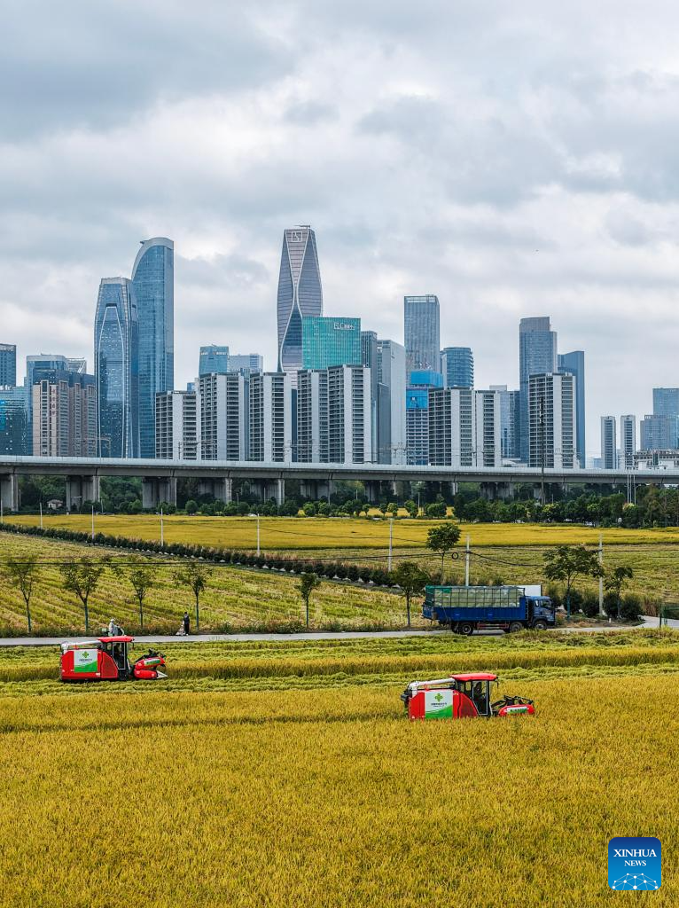 A drone photo taken on Oct. 21, 2025 shows harvesters harvesting rice in a paddy field in Hangzhou, east China's Zhejiang Province. (Xinhua/Xu Yu)