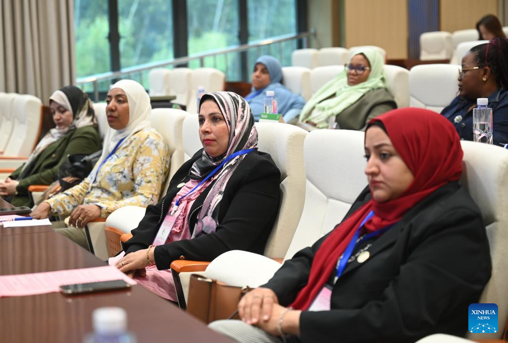 Trainees attend the opening ceremony of the training course on poverty alleviation through Juncao technology for women in developing countries in Fuzhou, southeast China's Fujian Province, Oct. 21, 2025.