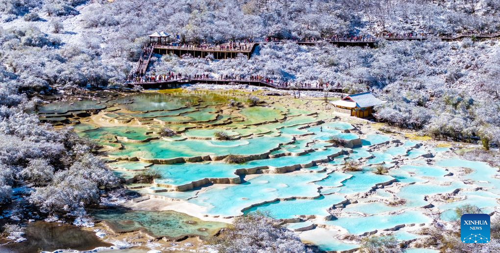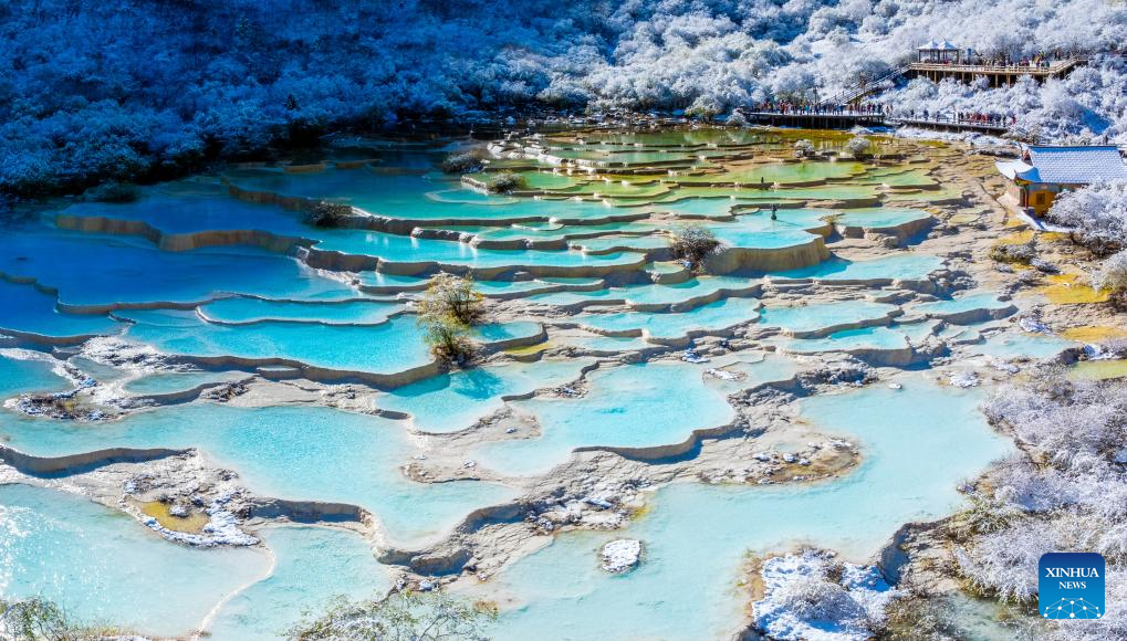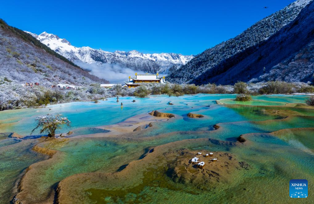 An aerial drone photo taken on Oct. 21, 2025 shows a view of a colorful pond cluster after snow at the Huanglong scenic area in Aba Tibetan and Qiang Autonomous Prefecture, southwest China's Sichuan Province.