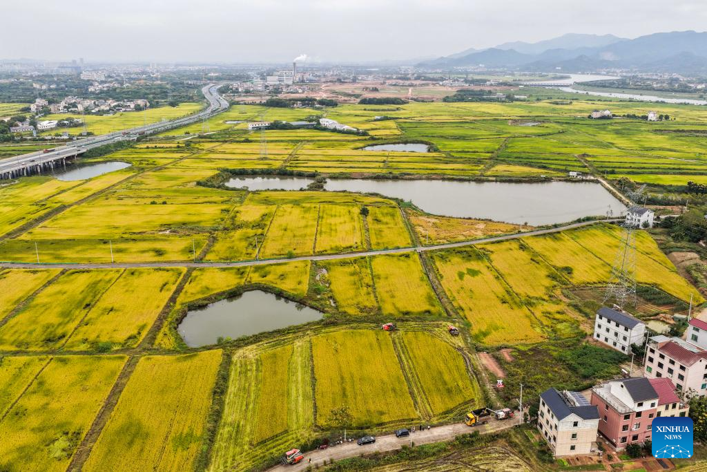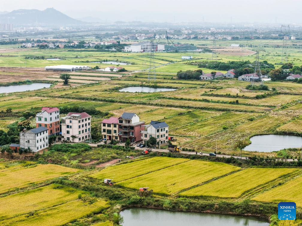 An aerial drone photo taken on Oct. 22, 2025 shows reapers harvesting paddy rice at a high-quality farmland demonstration area in Tangya Town of Jindong District, Jinhua City in east China's Zhejiang Province. (Xinhua/Xu Yu)