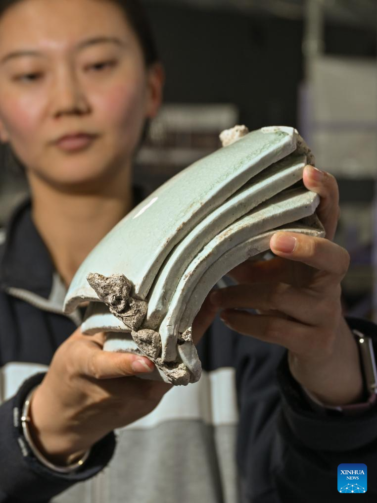 A staff member displays excavated porcelain fragments inside the cultural relics storage room of the archaeologist team working on the remnants of the Suyukou kiln, in Yinchuan, capital of northwest China's Ningxia Hui Autonomous Region, Oct. 13, 2025. Remnants of the Suyukou kiln were discovered in 2017 in Yinchuan, capital of Ningxia, and cover an area of roughly 40,000 square meters. (Xinhua/Li He)