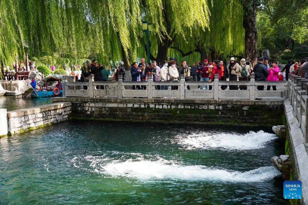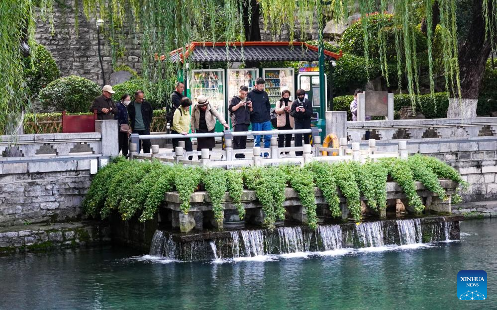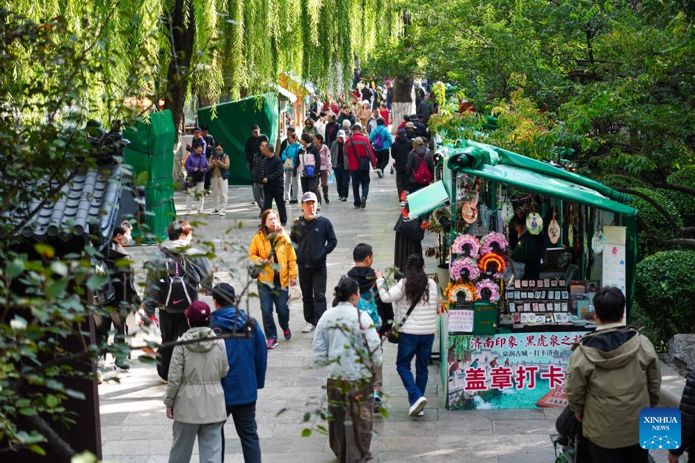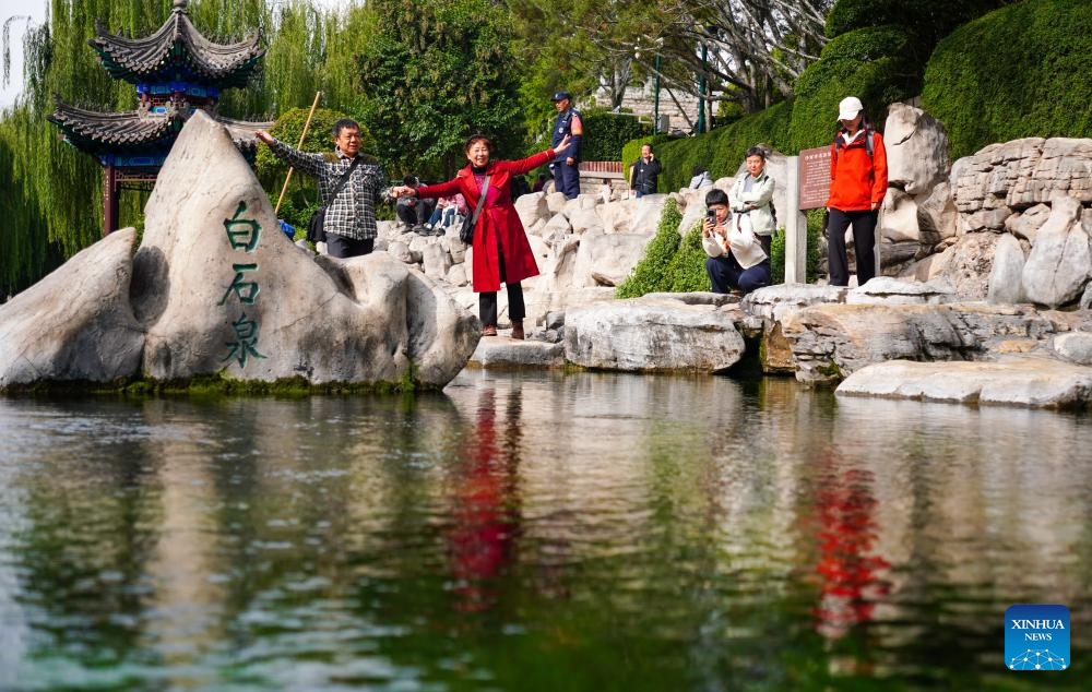 People enjoy the spring scenery along the spring greenway in Jinan, east China's Shandong Province, Oct. 22, 2025. Many citizens and tourists here have recently been attracted by spouting springs along the city's spring greenway, a 6.6-kilometer-long pavement connecting several springs and historical sites along the city's moat and Daming Lake Park. (Xinhua/Xu Suhui)