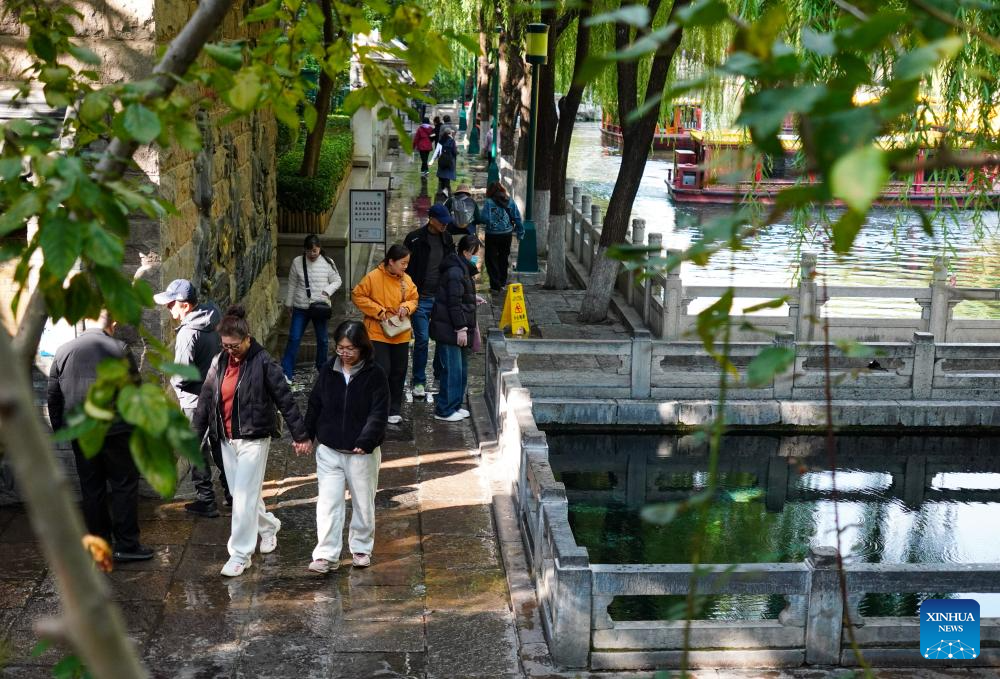 People walk along the spring greenway in Jinan, east China's Shandong Province, Oct. 22, 2025. Many citizens and tourists here have recently been attracted by spouting springs along the city's spring greenway, a 6.6-kilometer-long pavement connecting several springs and historical sites along the city's moat and Daming Lake Park. (Xinhua/Xu Suhui)