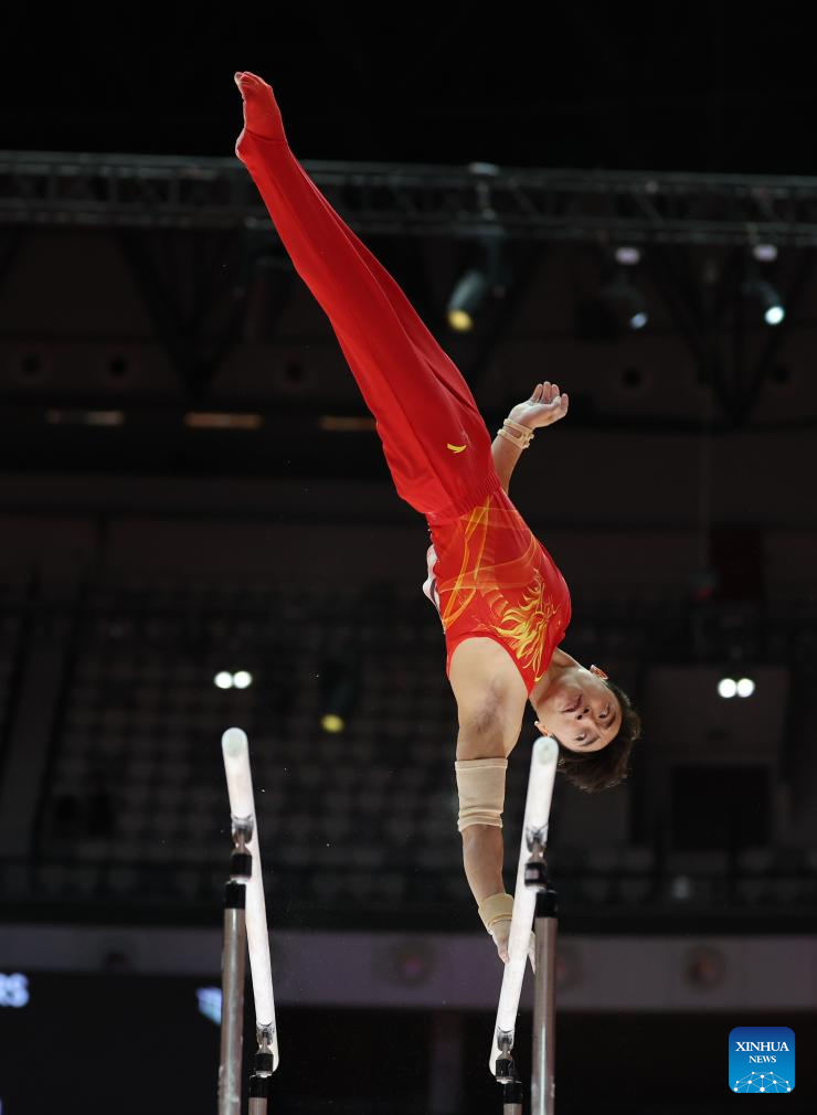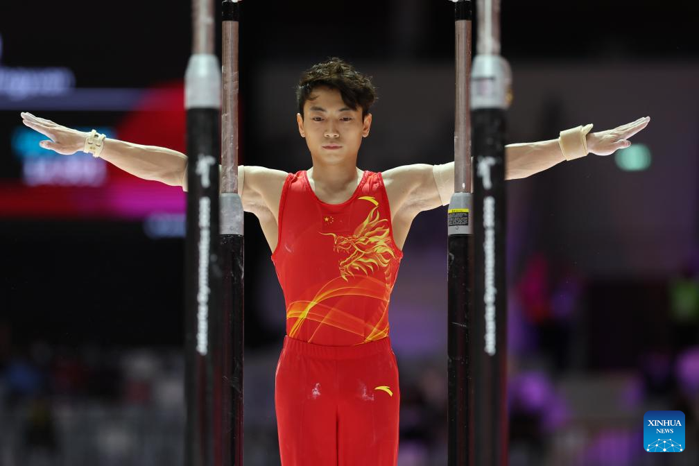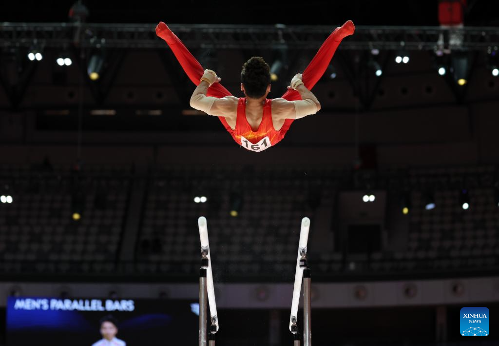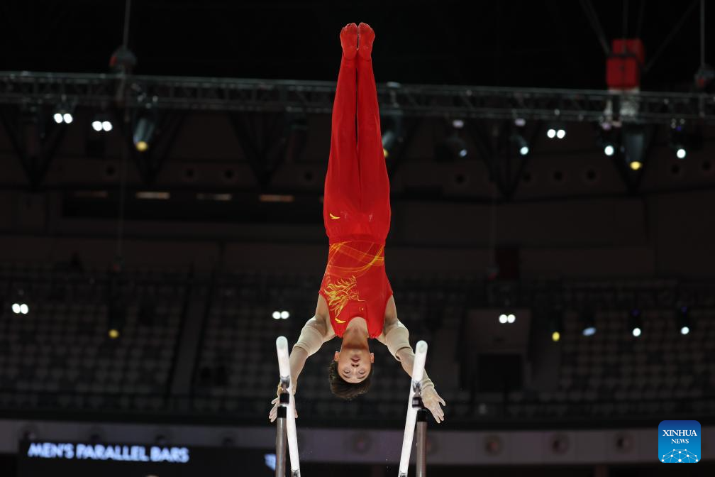 Zou Jingyuan of China competes during the the Men's Parallel Bars Final at 53rd FIG Artistic Gymnastics World Championships in Jakarta, Indonesia, on Oct. 25, 2025. (Xinhua/Bai Xuefei)