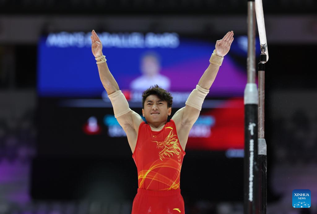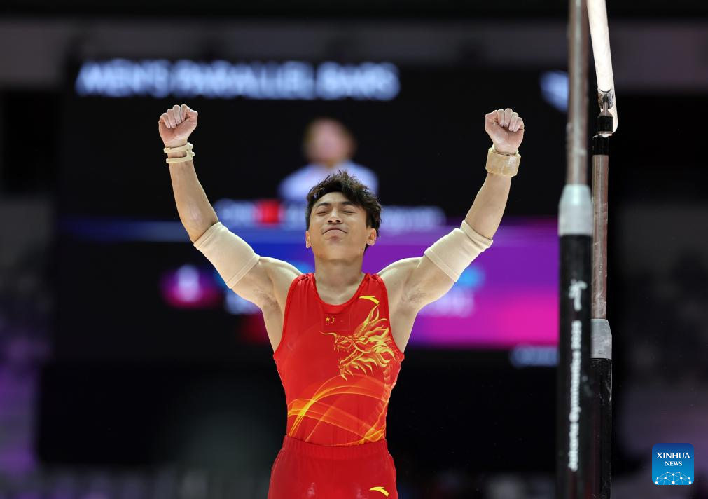 Zou Jingyuan of China celebrates during the the Men's Parallel Bars Final at 53rd FIG Artistic Gymnastics World Championships in Jakarta, Indonesia, on Oct. 25, 2025. (Xinhua/Bai Xuefei)