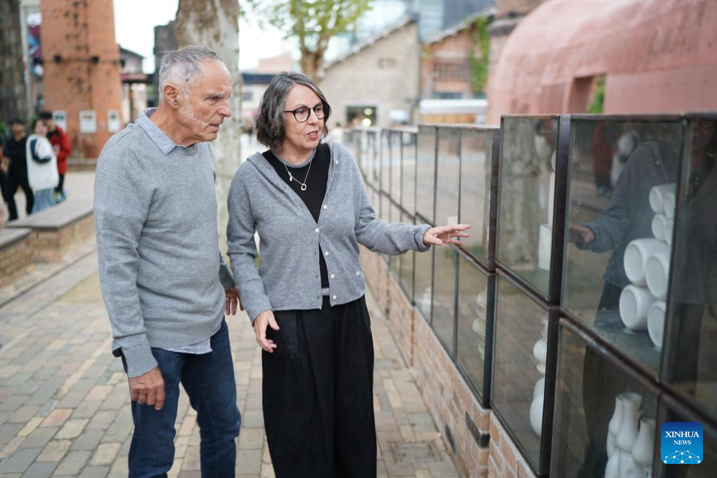 Christiane Toewe (2nd L) communicates with a foreign artist while visiting a market at Taoxichuan Ceramic Art Avenue in Jingdezhen City, east China's Jiangxi Province, Oct. 19, 2025. (Xinhua/Zhou Mi)