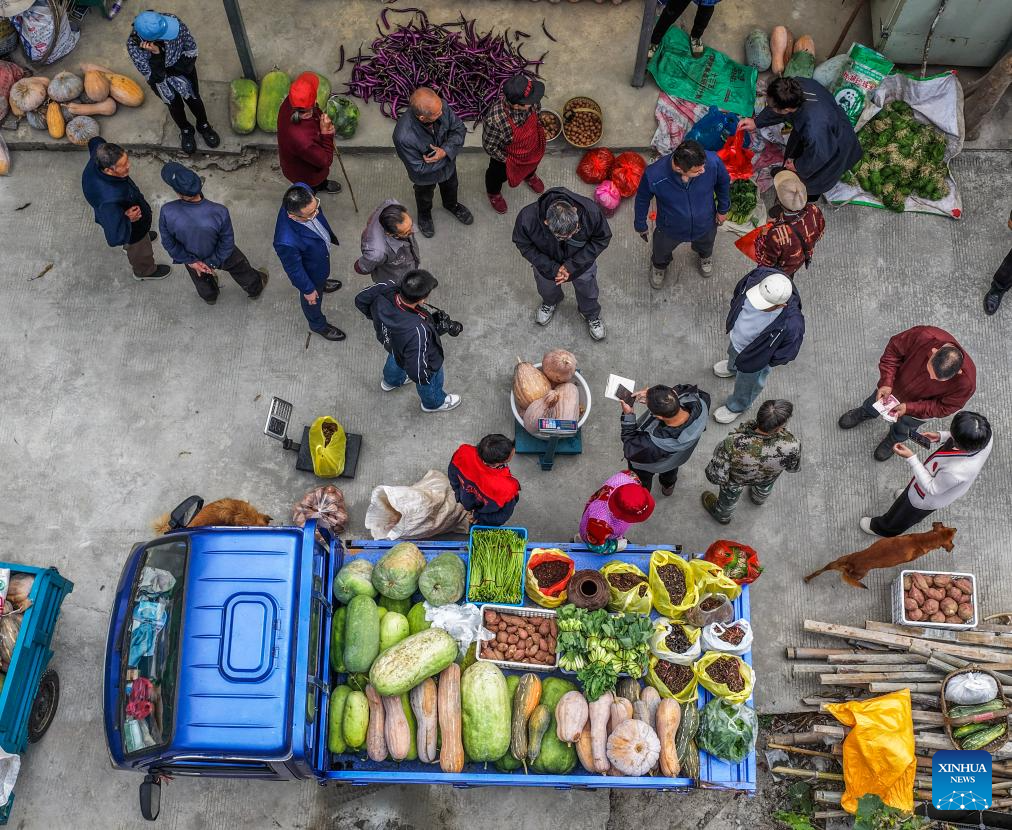 An aerial drone photo taken on Oct. 27, 2025 shows staff members from catering enterprises purchasing agricultural products from elderly villagers in Guantian Village of Chun'an County in Hangzhou City, east China's Zhejiang Province. A series of celebration activities were held across the country to mark China's Chongyang Festival, which will fall on Oct. 29 this year. Also known as Seniors' Day in China nowadays, it highlights the public's care for older people. (Xinhua/Xu Yu)