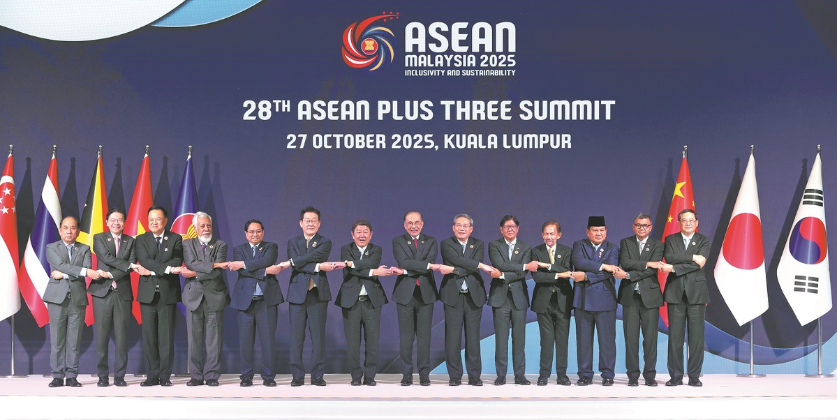 Premier Li Qiang (sixth from right) stands for a group photo with other leaders attending the 28th ASEAN Plus Three Summit on Monday in Kuala Lumpur, Malaysia. ZOU HONG/CHINA DAILY