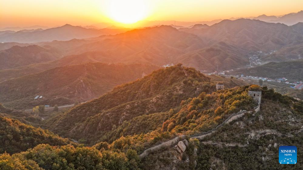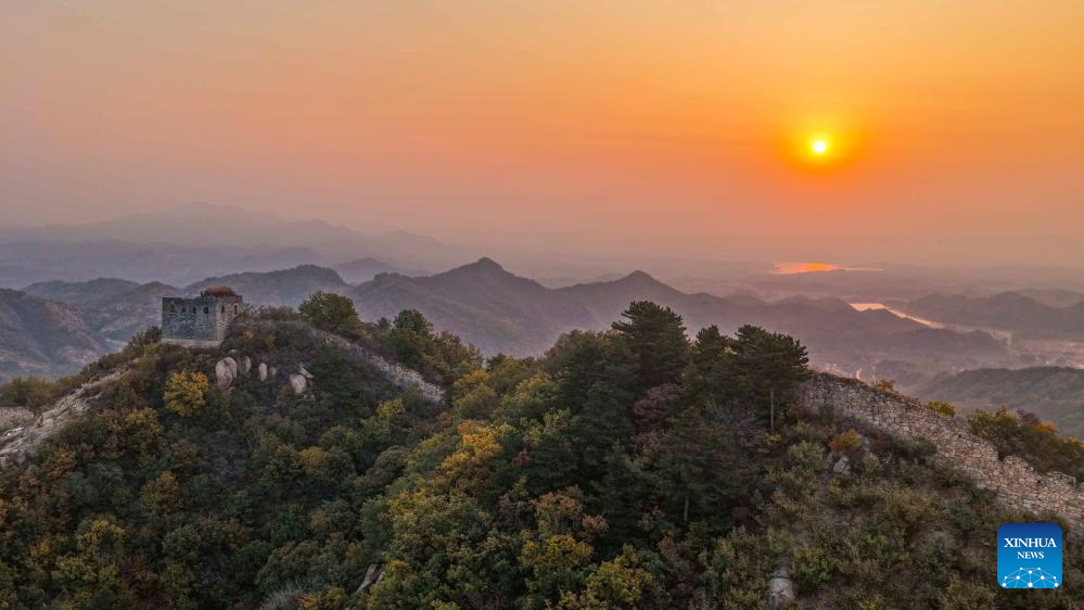 An aerial drone photo taken on Oct. 27, 2025 shows the scenery during sunset at a section of the ancient Great Wall in Zunhua City of north China's Hebei Province. (Photo by Liu Mancang/Xinhua)