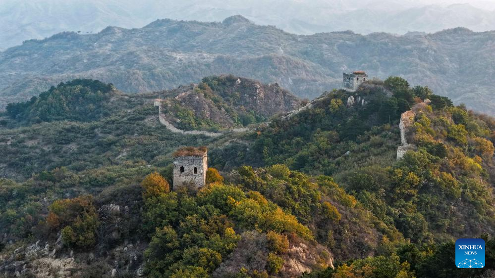 An aerial drone photo taken on Oct. 28, 2025 shows the scenery in the morning at a section of the ancient Great Wall in Zunhua City of north China's Hebei Province. (Photo by Liu Mancang/Xinhua)