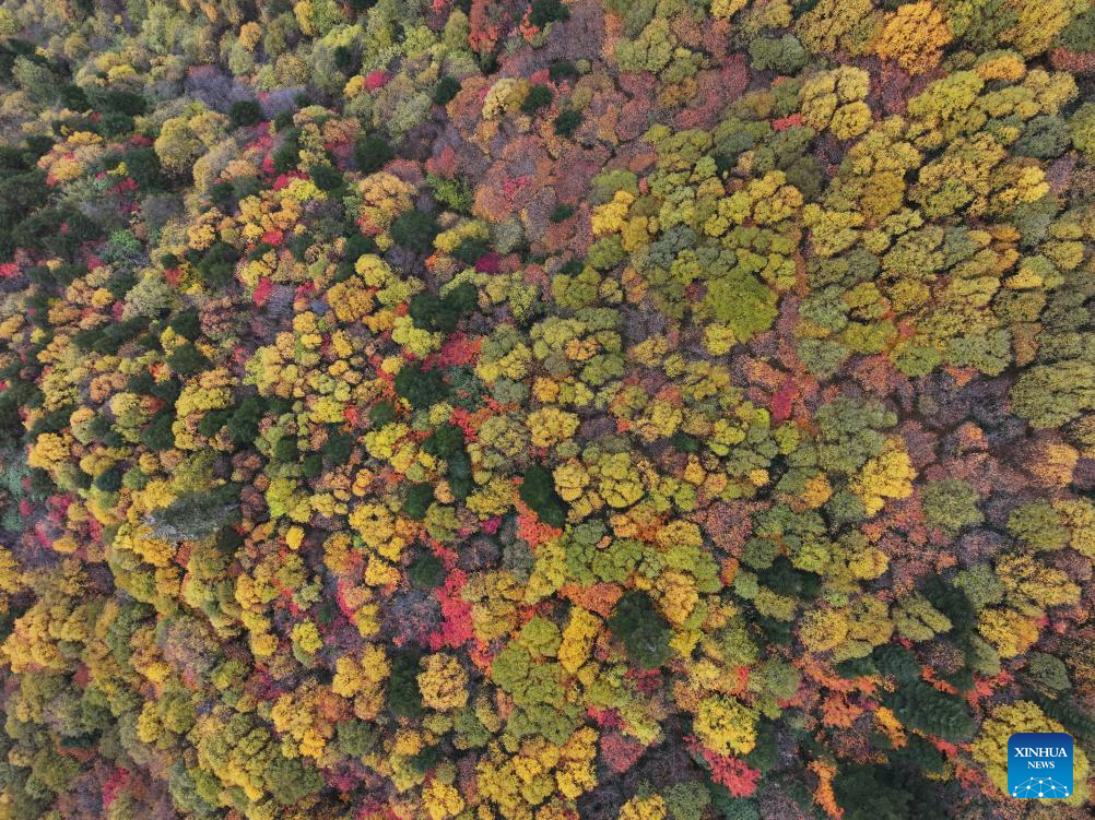 An aerial drone photo taken on Oct. 28, 2025 shows the autumn scenery of Serkyim La Mountain in Nyingchi, southwest China's Xizang Autonomous Region. (Xinhua/Lu Danyang)