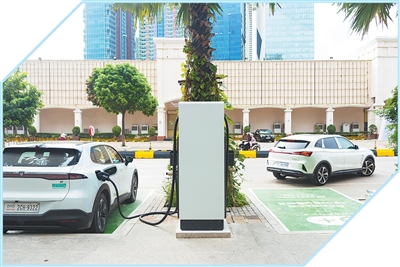 A Chinese-made electric vehicle charges at a charging station in Phnom Penh, Cambodia. (Photo/People's Daily)