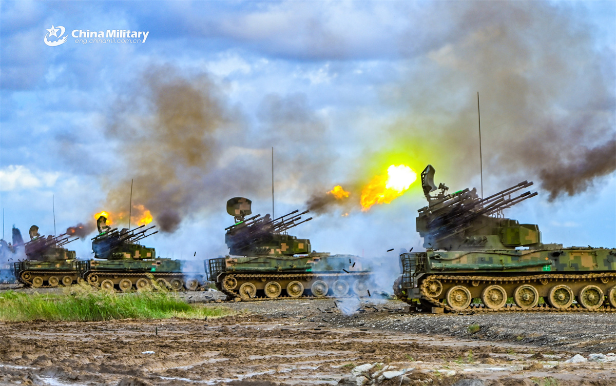 PGZ-04 self-propelled anti-aircraft vehicles attached to an air defense detachment of a brigade under the Chinese PLA 71st Group Army fire at the targets during a live-fire tactical combat training on September 22, 2025. (eng.chinamil.com.cn/Photo by Lin Weihong)
