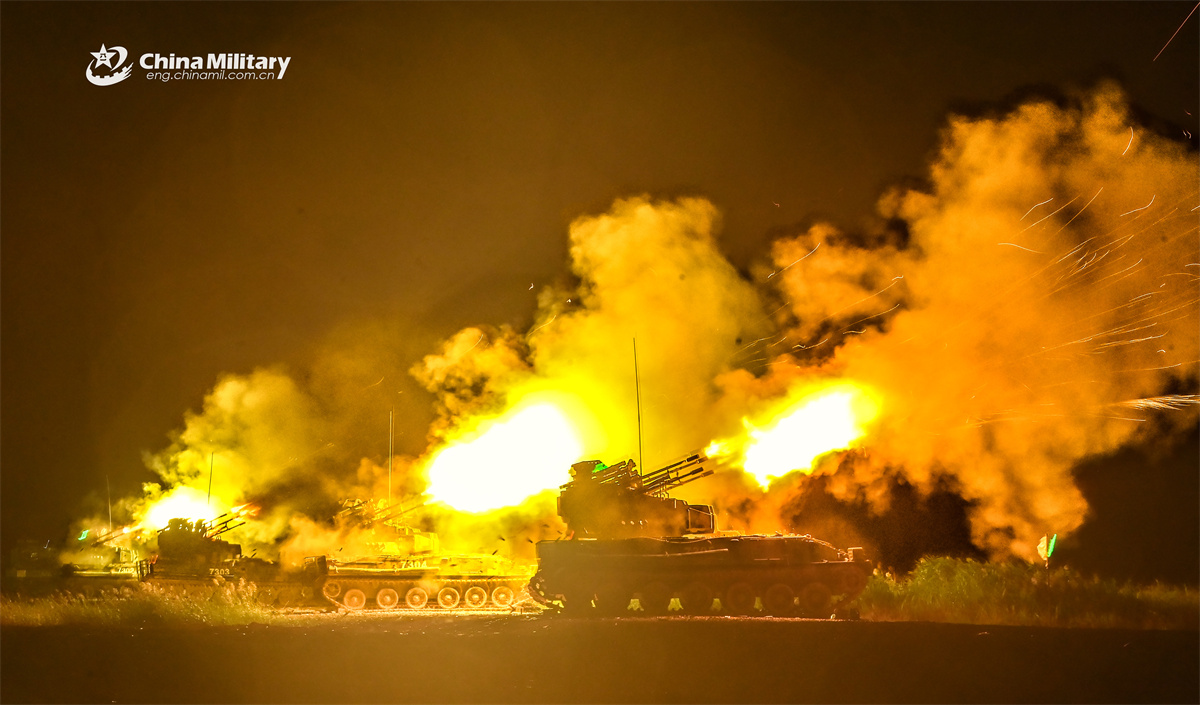 PGZ-04 self-propelled anti-aircraft vehicles attached to an air defense detachment of a brigade under the Chinese PLA 71st Group Army fire at the targets during a live-fire tactical combat training on September 22, 2025. (eng.chinamil.com.cn/Photo by Lin Weihong)