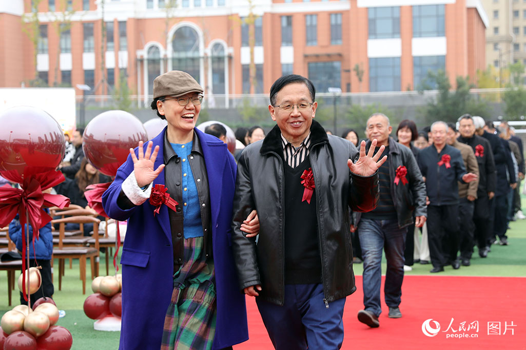 99 elderly couples celebrating their golden weddings walk arm-in-arm down a red carpet on Oct. 26, 2025, at a primary school playground in Jinan, east China's Shandong Province, recreating memorable moments from decades ago with blessings from student volunteers. (People's Daily Online/Liu Qi)