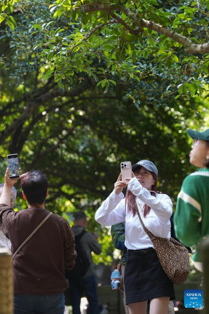 Tourists take photos of osmanthus flowers at Manjuelong Village in Hangzhou, east China's Zhejiang Province, Oct. 29, 2025. Recently, osmanthus flowers in Hangzhou have entered blooming period. More than 5 million osmanthus trees are planted across the city, according to local authorities. (Xinhua/Huang Zongzhi)