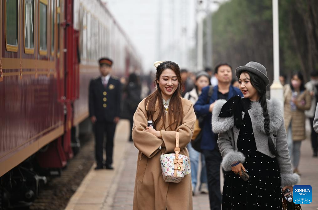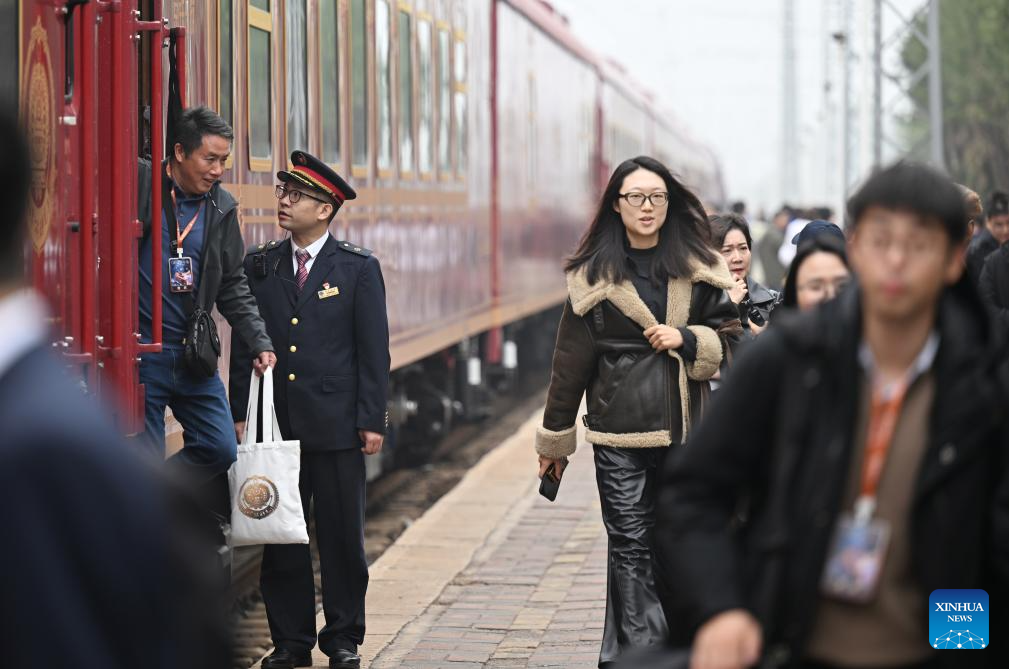 Passengers arrive at Jizhou North Railway Station by the Tianjin Fantasy Express train in north China's Tianjin, Oct. 30, 2025. The Tianjin Fantasy Express, China's first passenger train dedicated to immersive cultural tourism, officially began operation on Thursday. The train features 10 distinctively themed carriages and song and dance performances. It currently operates on a scheduled round-trip service between Tianjin North Railway Station and Jizhou North Railway Station. (Xinhua/Li Ran)