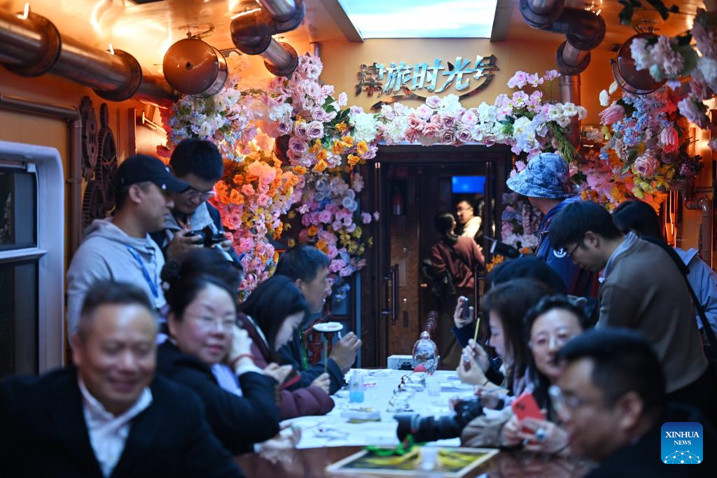 Passengers communicate inside a themed carriage of the Tianjin Fantasy Express train in north China's Tianjin, Oct. 30, 2025. The Tianjin Fantasy Express, China's first passenger train dedicated to immersive cultural tourism, officially began operation on Thursday. The train features 10 distinctively themed carriages and song and dance performances. It currently operates on a scheduled round-trip service between Tianjin North Railway Station and Jizhou North Railway Station. (Xinhua/Li Ran)
