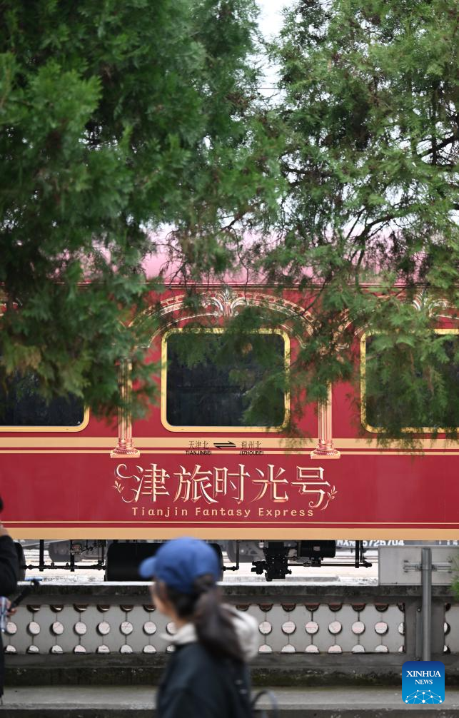 The Tianjin Fantasy Express train arrives at Jizhou North Railway Station in north China's Tianjin, Oct. 30, 2025. The Tianjin Fantasy Express, China's first passenger train dedicated to immersive cultural tourism, officially began operation on Thursday. The train features 10 distinctively themed carriages and song and dance performances. It currently operates on a scheduled round-trip service between Tianjin North Railway Station and Jizhou North Railway Station. (Xinhua/Li Ran)