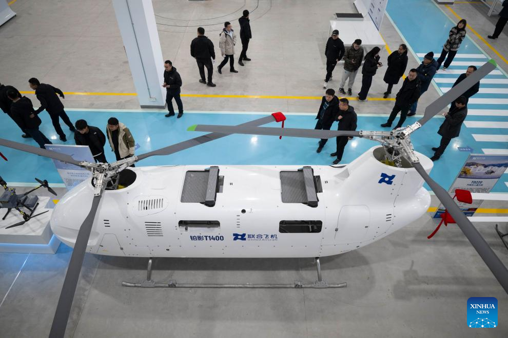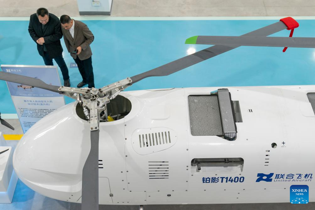 People visit the Boying T1400 Tandem Rotor Unmanned Helicopter at the factory of United Aircraft in Harbin, northeast China's Heilongjiang Province, Oct. 30, 2025. The helicopter successfully completed its maiden flight here on Thursday. It has a maximum takeoff weight of 1,400 kilograms, an endurance of up to eight hours, a service ceiling of 6,500 meters, and a maximum horizontal flight speed of 180 kilometers per hour.