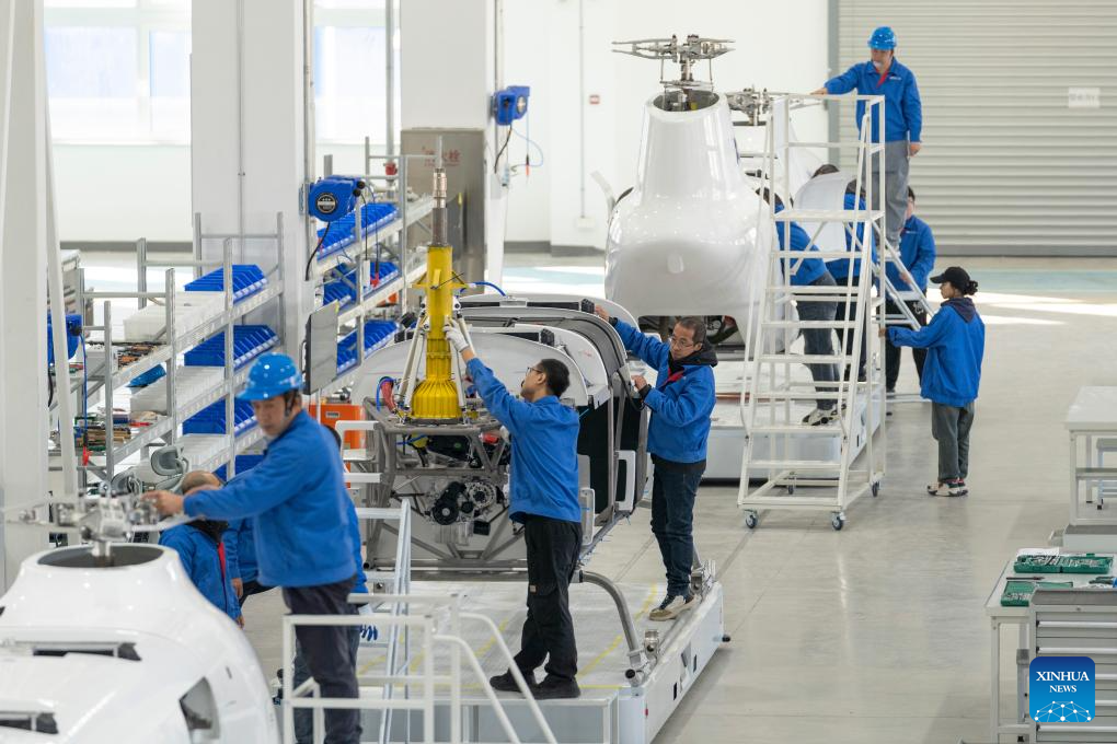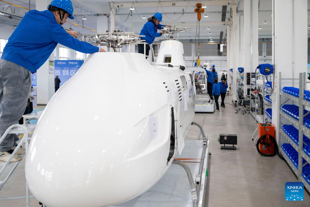 Workers assemble the Boying T1400 Tandem Rotor Unmanned Helicopter at the factory of United Aircraft in Harbin, northeast China's Heilongjiang Province, Oct. 30, 2025. The helicopter successfully completed its maiden flight here on Thursday. It has a maximum takeoff weight of 1,400 kilograms, an endurance of up to eight hours, a service ceiling of 6,500 meters, and a maximum horizontal flight speed of 180 kilometers per hour.