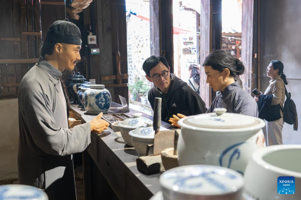 Tourists visit the ancient street in Yangloudong of Chibi City, central China's Hubei Province, Oct. 29, 2025. Yangloudong has long been renowned as the hometown of brick tea and is one of the starting points of an ancient tea road. In recent years, the area has built a new tourism model to attract tourists by creating intangible cultural heritage themed blocks and introducing diversified business formats such as Hanfu-renting and photograph. (Xinhua/Du Zixuan)