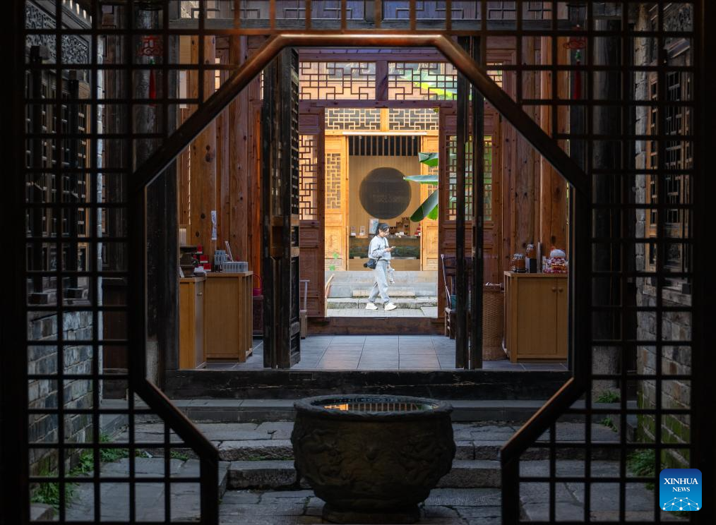 A tourist visits the ancient street in Yangloudong of Chibi City, central China's Hubei Province, Oct. 29, 2025. Yangloudong has long been renowned as the hometown of brick tea and is one of the starting points of an ancient tea road. In recent years, the area has built a new tourism model to attract tourists by creating intangible cultural heritage themed blocks and introducing diversified business formats such as Hanfu-renting and photograph. (Xinhua/Du Zixuan)