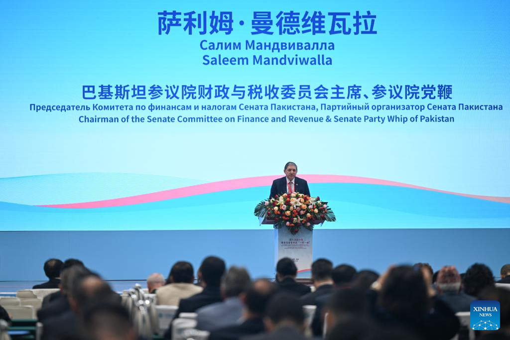 Saleem Mandviwalla, chairman of the Senate Committee on Finance and Revenue &Senate Party Whip of Pakistan, addresses the opening ceremony of the China (Kashgar) - Central and South Asia Forum on the Rule of Law (2025) in Kashgar, northwest China's Xinjiang Uygur Autonomous Region, Oct. 30, 2025. The forum kicked off here on Thursday. (Xinhua/Ding Lei)