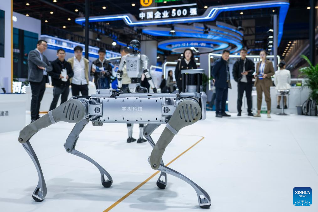 People look at a robot dog from Unitree Robotics during the 2025 International (Wuhan) Intelligent Building Industry Expo at the China Optics Valley Convention and Exhibition Center in Wuhan, central China's Hubei Province, Oct. 31, 2025. With an exhibition area of approximately 20,000 square meters, the expo kicked off here on Friday, drawing exhibitors from over 10 countries and regions. (Xinhua/Wu Zhizun)