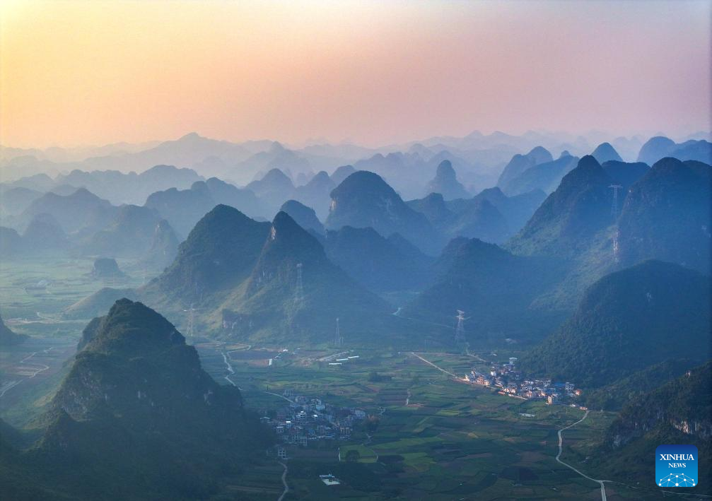An aerial drone photo taken on March 20, 2025 shows the Jueshan Village of Sandu Town, Liuzhou City, south China's Guangxi Zhuang Autonomous Region. (Xinhua/Huang Xiaobang)