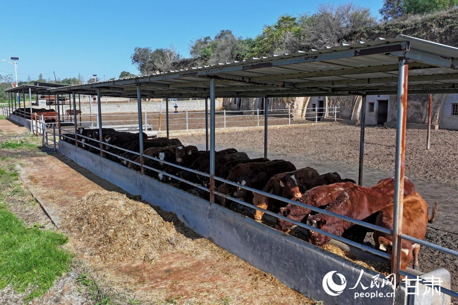 Photo shows cattle raised at cattle barn renovated from cave dwellings in Ganzhuang village, Huangzhai town, Chongxin county, Pingliang city, northwest China's Gansu Province. (People's Daily Online/Mi Yuan)