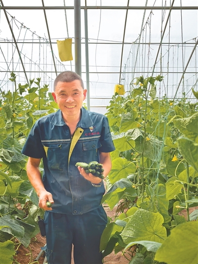 Wang Konghui, head of a facility agriculture company, shows cucumbers in a greenhouse in Keping county, Aksu Prefecture, northwest China's Xinjiang Uygur Autonomous Region. (People's Daily Overseas Edition/Yu Shangbo)