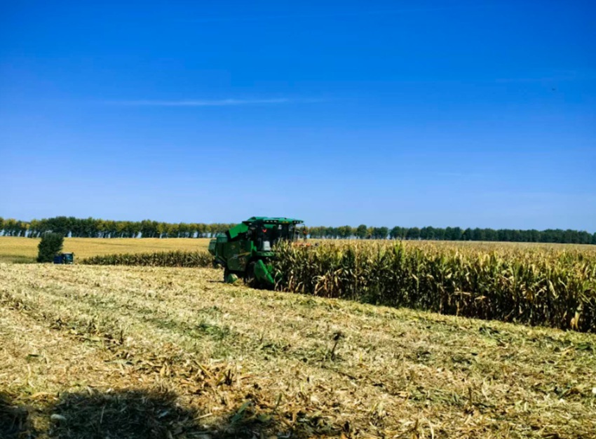 A combine harvester reaps corn in a field in northeast China's Jilin Province. (Photo courtesy of the interviewee)