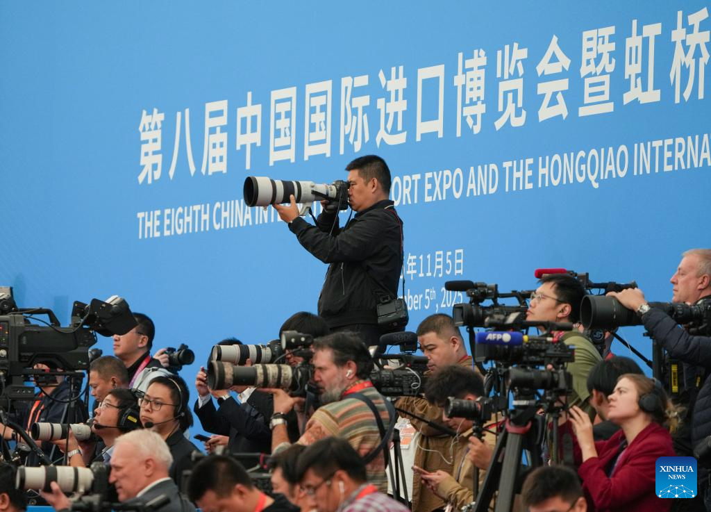 Photojournalists work at the opening ceremony of the eighth China International Import Expo (CIIE) and the Hongqiao International Economic Forum in Shanghai, east China, Nov. 5, 2025. The eighth CIIE and Hongqiao International Economic Forum opened here on Wednesday. (Xinhua/Ren Pengfei)