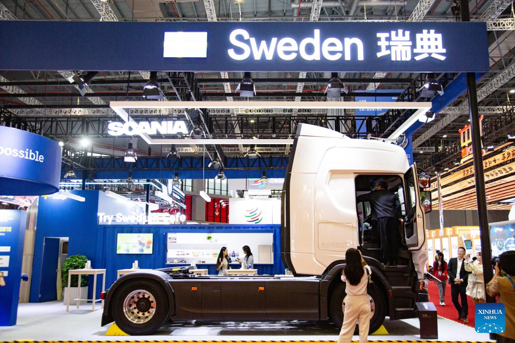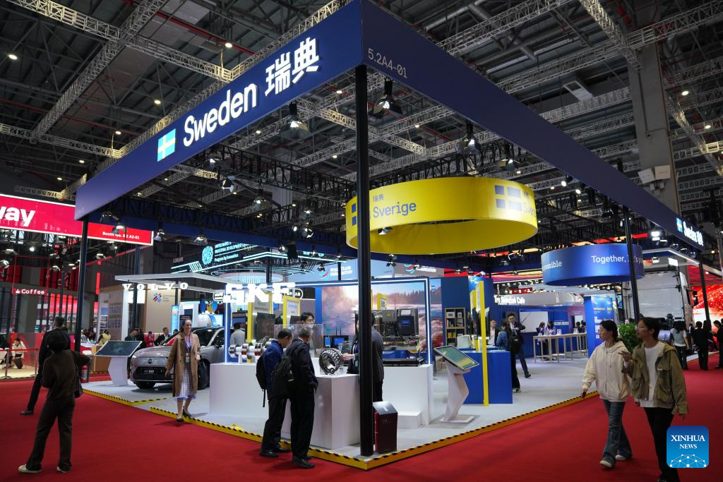 This photo shows the Sweden Pavilion during the eighth China International Import Expo (CIIE) in east China's Shanghai, Nov. 5, 2025. The eighth CIIE opened here on Wednesday. Thailand, the United Arab Emirates, Nigeria, Georgia, Sweden and Colombia serve as the guest countries of honor at this year's CIIE. (Xinhua/Tian Weiwei)