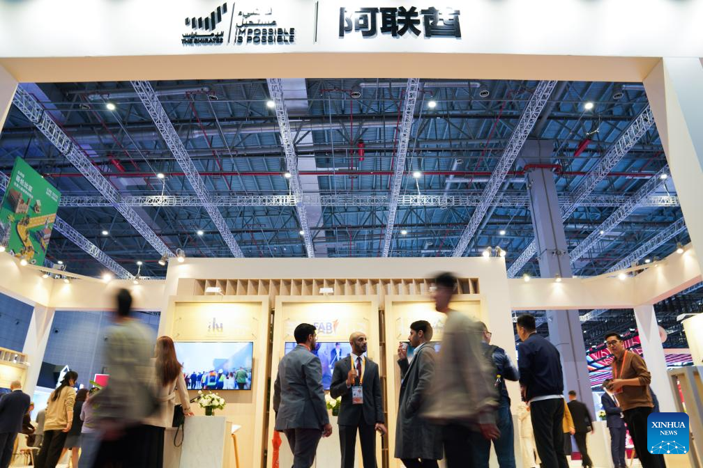 This photo shows the United Arab Emirates Pavilion during the eighth China International Import Expo (CIIE) in east China's Shanghai, Nov. 5, 2025. The eighth CIIE opened here on Wednesday. Thailand, the United Arab Emirates, Nigeria, Georgia, Sweden and Colombia serve as the guest countries of honor at this year's CIIE. (Xinhua/Fan Yuqing)