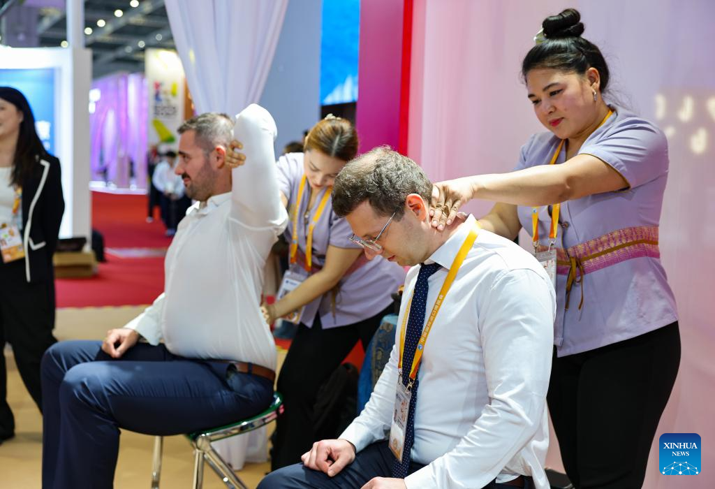 Visitors experience Thai massage at the Thailand Pavilion during the eighth China International Import Expo (CIIE) in east China's Shanghai, Nov. 5, 2025. The eighth CIIE opened here on Wednesday. Thailand, the United Arab Emirates, Nigeria, Georgia, Sweden and Colombia serve as the guest countries of honor at this year's CIIE. (Xinhua/Wang Zecong)