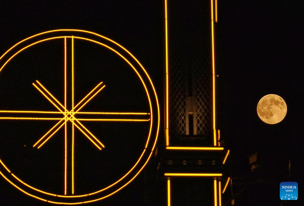 A drone photo taken on Nov. 5, 2025 shows a full moon on the sky over a neon sign in Nantong, east China's Jiangsu Province, on Nov. 5, 2025. Lunar observers will be able to see the largest and brightest full moon of 2025 when the moon reaches its closest point to Earth at 9:19 p.m. Beijing Time on Wednesday. (Photo by Xu Congjun/Xinhua)